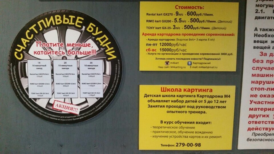 Заранее подумайте относительно времени посещения картодрома М4, чтобы вам было у нас максимально комфортно. Узнать нужную информацию вы можете здесь на сайте, а также непосредственно во время визита к нам.